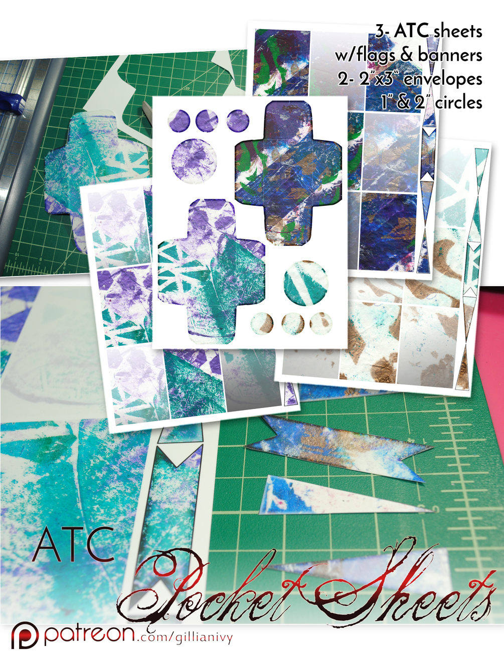 PDF file of printable pages. 3 sheets of ATC pocket sheet cards (9 per page) with flags and banners to match each set. 2- 2"x3" envelopes w/ 1" and 2" circle embellishments.