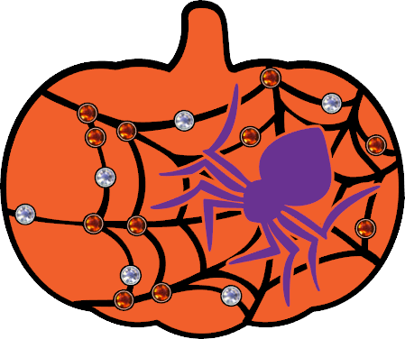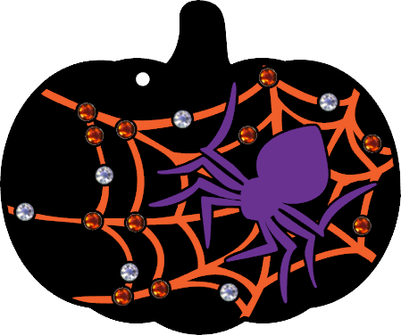 SVG design for 3" Zindee Pumpkin (affiliate link), featuring a spider with web in 2 styles, plus rhinestone template (2 layers). Designed specifically to match Zindee acrylic (affiliate link), may not work on other products.